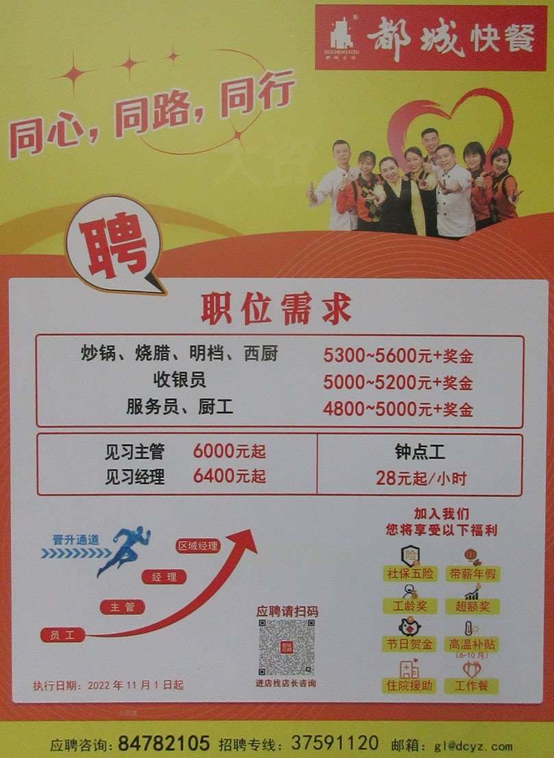 北区-创智园5栋西侧 都城餐厅 招聘职位:炒锅、烧腊、明档、西厨-5300~5600元+奖金;收银员-5000~5200元+奖金;服务员、厨工-4800~5000元+奖金;见习主管-6000元起;见习经理-6400元起;钟点工-28元起1小时 应聘可以扫码or进店咨询店长 招聘专线:37591120