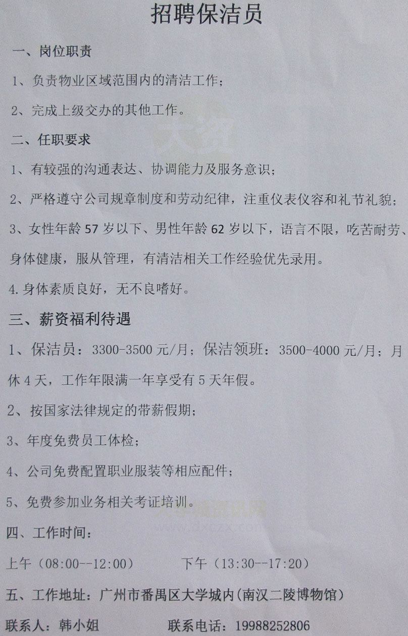 广州大学城内 南汉二陵博物馆 招聘保洁员 薪资3300-4000元 月休4天 联系19988252806韩小姐