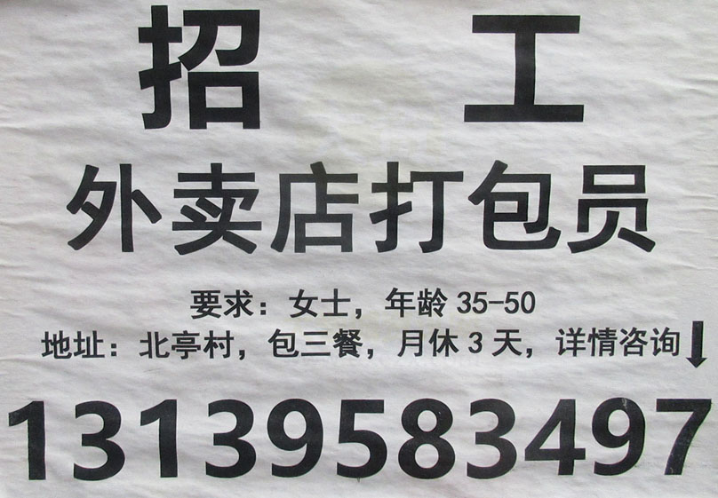 北亭村外卖店招聘打包员 要求女士 年龄35-50岁 包三餐 月休3天 详情咨询13139583497