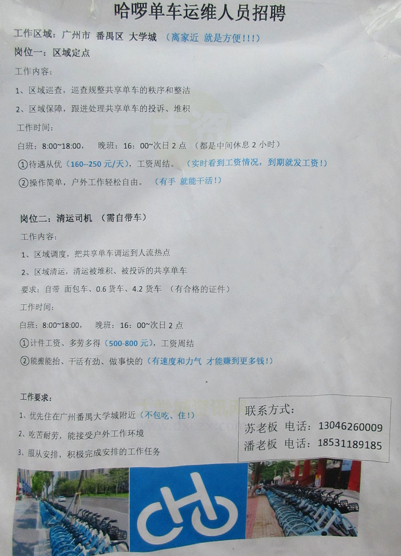 哈啰单车广州大学城运维人员招聘 联系13046260009苏生 18531189185潘生