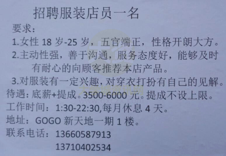 招聘服装店员一名