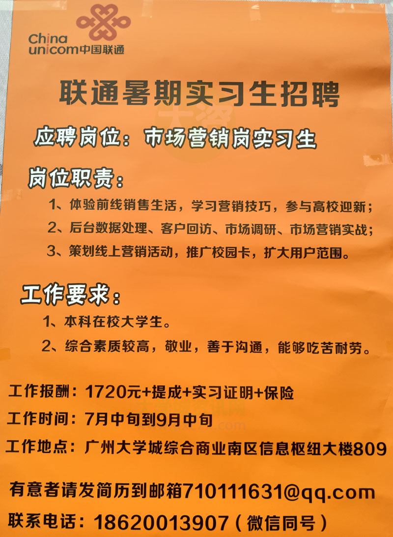 中国联通大学城网点招聘暑期实习生 具体岗位为市场营销 有意者发简历or微电